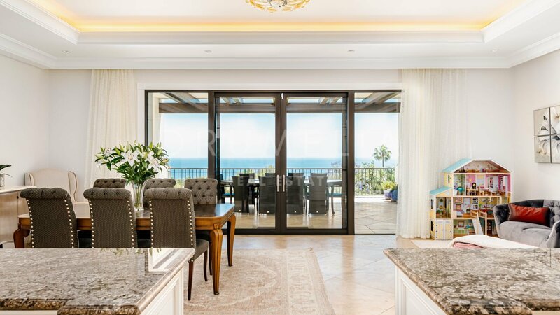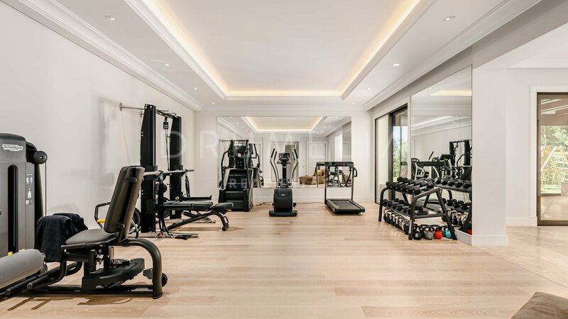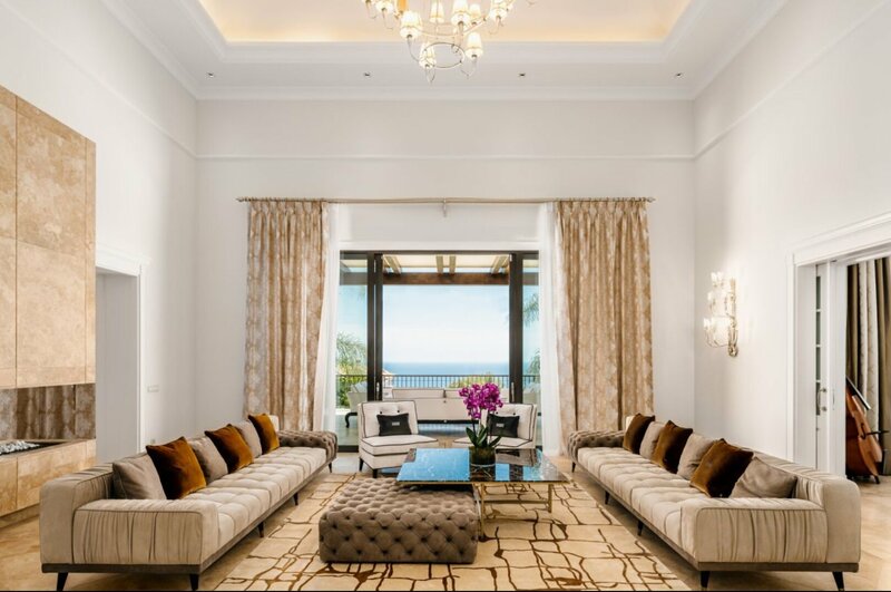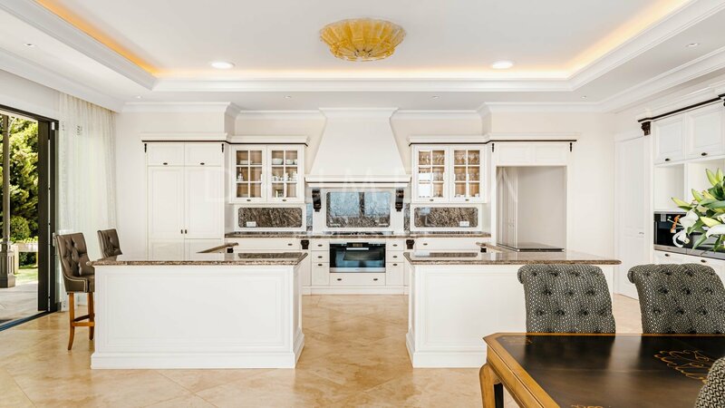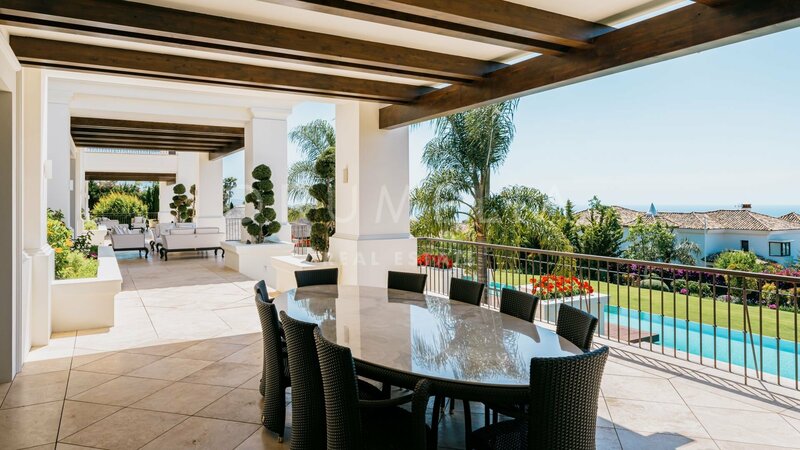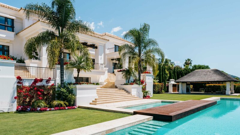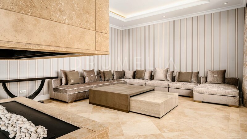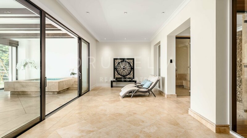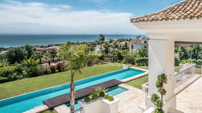 Villa for sale in Sierra Blanca, Marbella Golden Mile Surrounded by pine trees and greenery of the prestigious Sierra Blanca, Marbella’s Golden Mile, this magnificent, newly built private estate with a generous double plot (5106 m²!) and stunning panoramic views is a Dream House for those who prefer elegant Mediterranean style, classic chic and modern comfort. Welcome to ‘Villa Tocatta’ which ranks among the finest homes on the Costa del Sol! Integrated into a dreamlike Mediterranean environment, it has been built with top-quality materials and offers luxurious design and cutting-edge amenities. The classic principles of scale, balance, proportion and symmetry are all there, and it gracefully presents detailed treatments of doors, windows, walls, stairways, columns and other beautiful features. The outstanding mansion impresses the moment you enter its welcoming hall, an amazing classical double stairs foyer with double height ceiling. It leads to a spacious main living room with a modern fireplace and different seating areas, TV lounge and an exquisite formal dining room. A top-range fully-fitted open plan kitchen with breakfast area and coffee corner is united with another delightful dining area. Gorgeous! Downstairs there are staff quarters with independent access, a machine room and professional laundry. The lower level is not a basement, but a ground floor that makes use of the natural slope of the land. It’s a great advantage because the private quarters, entertainment rooms, SPA and fitness area (with gym, sauna, steam room, Jacuzzi and accompanying facilities) benefit from natural light, sun and fantastic views. Another large room on the ground floor can be used a separate guest apartment. The main floor hosts 2 out of 7 bedrooms; they share a living area and both enjoy open sea views. The top floor features 2 guest suits, a living room, an office and an extraordinary Master suite with beautifully styled and finished ‘his’ and ‘hers’ bathrooms, dressing areas ideal for displaying fashion designers’ collections and a private terrace with breathtaking views. On the lower floor 2 bedrooms sharing a bathroom have direct access to wonderful landscaped subtropical gardens with an imposing heated pool, cabaña with exotic roof and lovely pool house area, plenty of chill-out and al fresco dining areas to enjoy the world-famous Mediterranean way of life. Only the best can be expected. The property boasts a noble, eye-pleasing natural colour palette, excellent marble floors, panoramic glass doors and glass wine cellar, quality carpentry fitted wardrobes, expansive and practical dressing room of exceptional taste and quality, large garage, covered and sunny terraces, solarium and private balconies perfect for enjoying sensational Mediterranean sunsets, a glass of wine or an iconic morning cup of coffee. Just imagine: 653 m² of terraces envelop your villa of 1299 m²! And the views! Views for daze! South-facing mansion commands an awe-inspiring panorama of Marbella and its coastline across the sparkling Mediterranean to North Africa and both legendary Pillars of Hercules flanking the entrance to the Strait of Gibraltar. Luxurious installations and features of the high-end property will make your living beautiful and comfortable. This property has it all! Modern and stylish, eco-friendly and energy-efficient, it comes with solar panels, central heating, air-conditioning, underfloor heating (throughout), double glazing, decorative ceilings, alarm, video entrance, water tank, etc. This remarkable villa has an exclusive address. It is set in the old-established classy residential area, gated, with 24-h security community of Sierra Blanca, one of the best and much sought-after neighbourhoods of Southern Europe, a few minutes away from the sandy beaches, golf courses, all amenities of Marbella Centre, the famous Golden Mile, the epitome of luxury, extravagance and opulence, and Puerto Banus, the glamorous playground of the rich & famous.